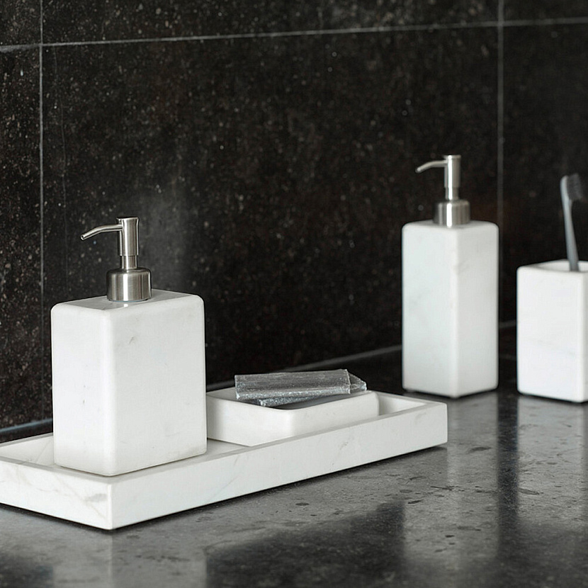 Изделия коллекции Hammam White изготовлены вручную из белого мрамора с естественным рисунком, что делает каждый предмет уникальным.