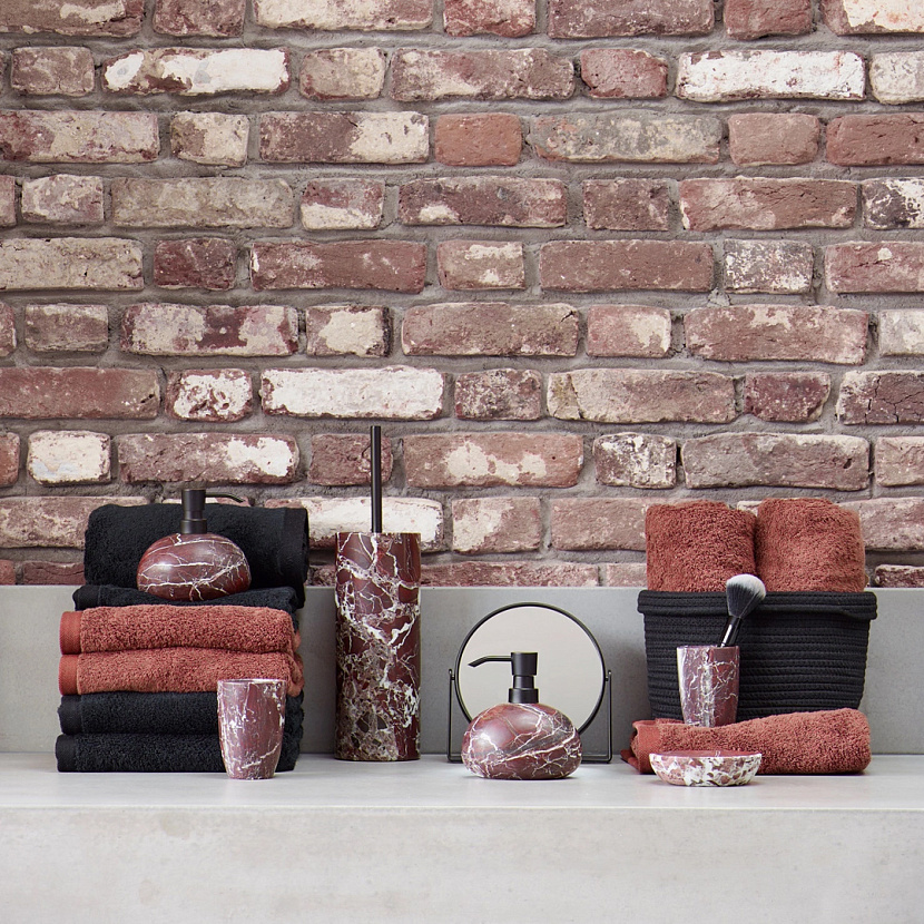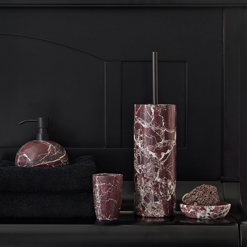 Изделия коллекции Mundo марки Aquanova изготовлены вручную из мрамора тёмно-красного оттенка с прожилками, обладающего уникальной эстетикой.