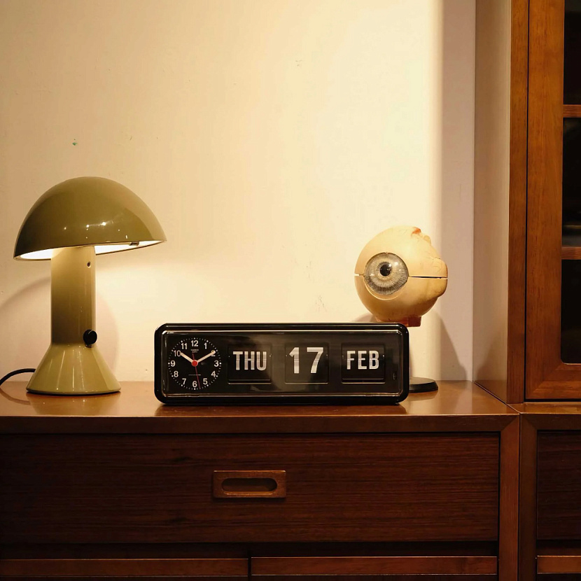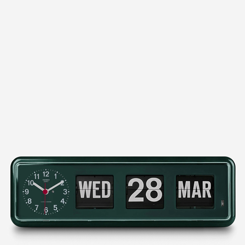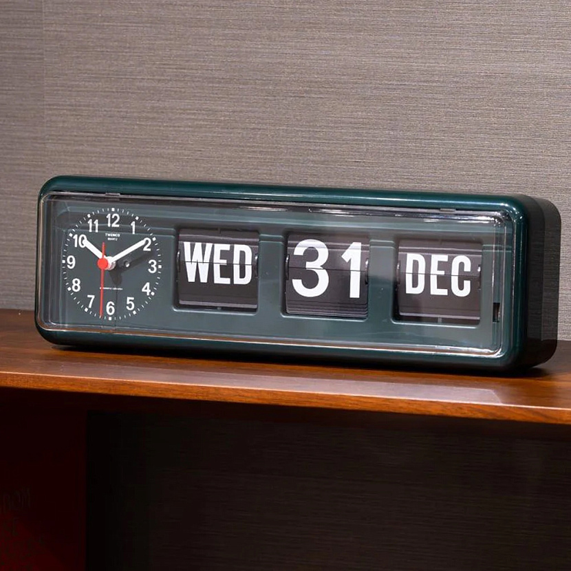 Настольные часы с календарём от TWEMCO, модель BQ-38 в корпусе зелёного цвета. Аналоговый циферблат виден на расстоянии >12 метров. Культовое изобретение TWEMCO гармонично дополнит разнообразие интерьеров.