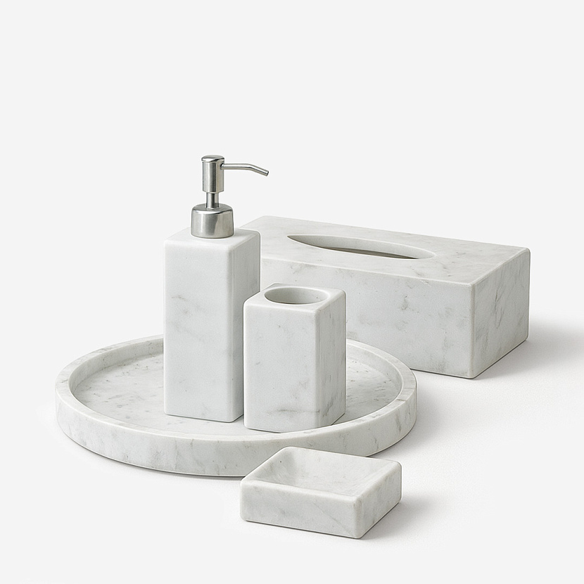 Изделия коллекции Hammam White изготовлены вручную из белого мрамора с естественным рисунком, что делает каждый предмет уникальным.