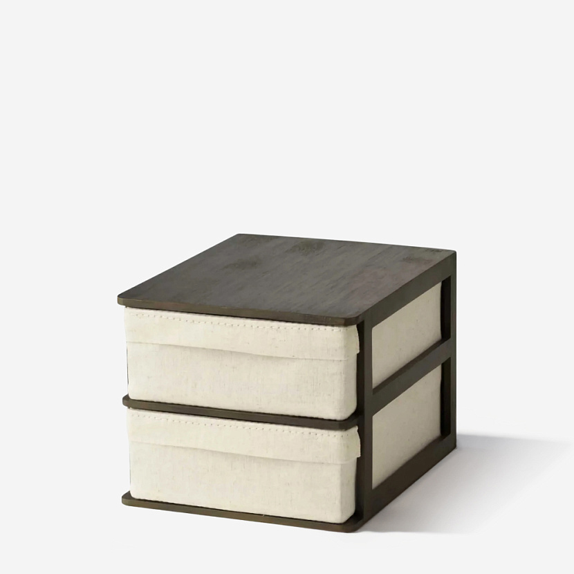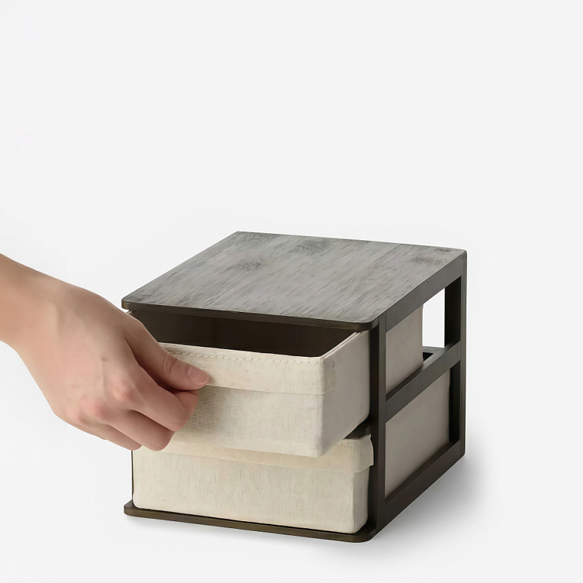 Настольный органайзер Ree с двумя выдвижными ящиками. Изготовлен из натурального бамбука, окрашенного в коричневый, ящики — из ткани. Решение отлично подойдёт для организации хранения в ванной, спальне или других пространствах дома. Произведено на Тайване.