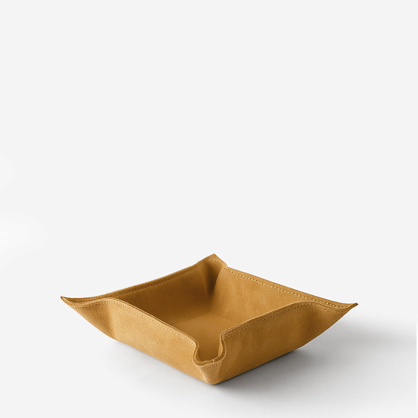 Поднос Jack квадратной формы со сгибающимися бортиками, изготовлен из высококачественной замши оттенка «mustard» итальянскими мастерами. Модель размера S.