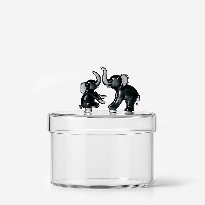 Конфетница Elephant Family из выдувного стекла, серия Tender Ties. На крышке изделия расположены фигурки слона и слонёнка. Дизайн разработан Алессандрой Бальдерески (Alessandra Baldereschi) специально для Ichendorf.