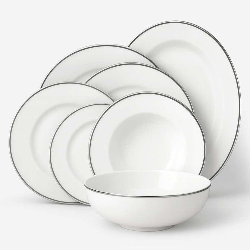 Обеденный сервиз Comet Platinum на шесть персон. Изделия из высококачественного костяного фарфора украшены окантовкой из платины. Лаконичный сервиз изготовлен и декорирован вручную мастерами компании Prouna.