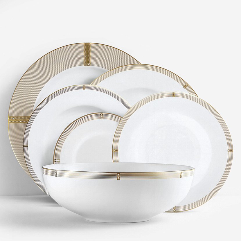Обеденный сервиз Regency Gold на шесть персон. Изделия из высококачественного костяного фарфора украшены окантовкой из золота 24K и кристаллами Swarovski. Сервиз изготовлен и декорирован вручную мастерами компании Prouna.