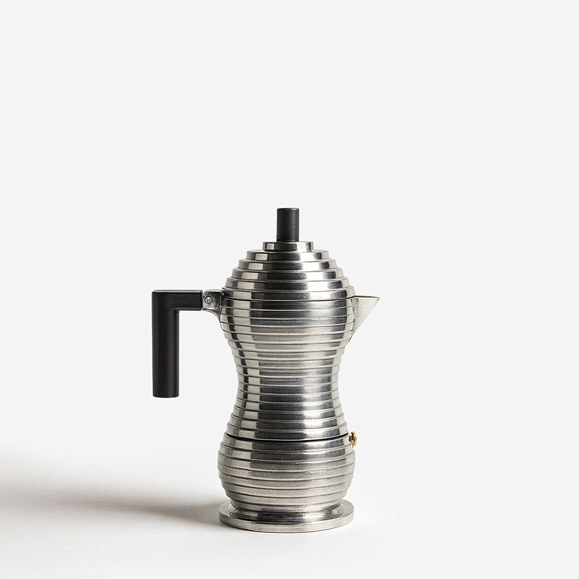 Гейзерная кофеварка Pulcina на шесть чашек. Настоящая революция Alessi, сочетающая в себе традиционную форму и инженерные инновации: фильтрация отключается автоматически, чтобы избежать горького послевкусия напитка. Создана в сотрудничестве с illycaffè. Дизайн — Микеле де Лукки (Michele de Lucchi).
