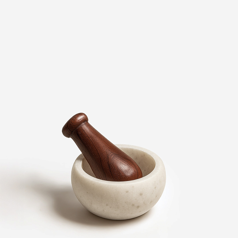 Ступка с пестиком Marble & Wood от американского бренда Hankar. Изготовлена из мрамора белого цвета, пестик — из дерева. Незаменимый аксессуар для любой кухни в современном стильном исполнении.