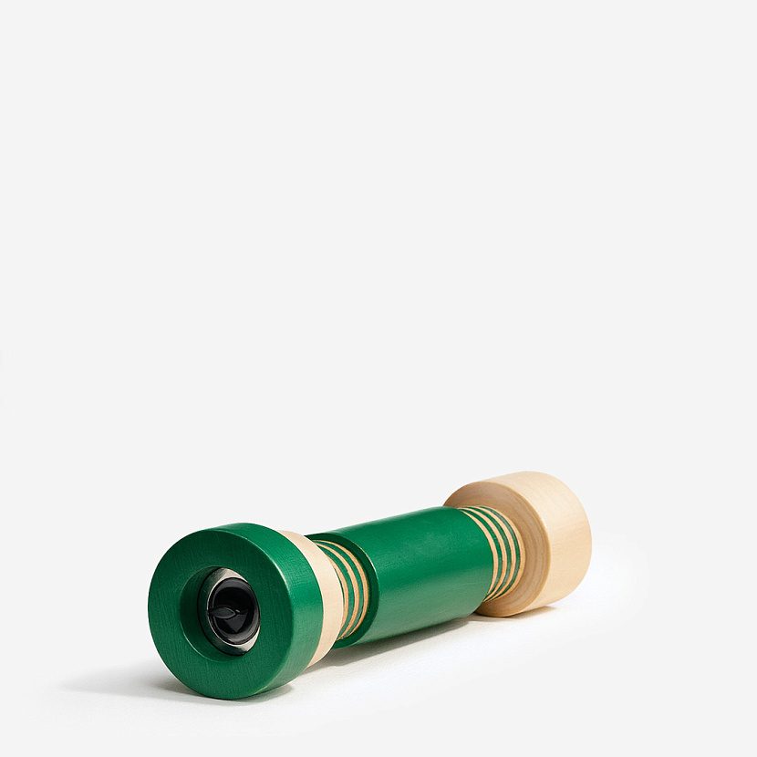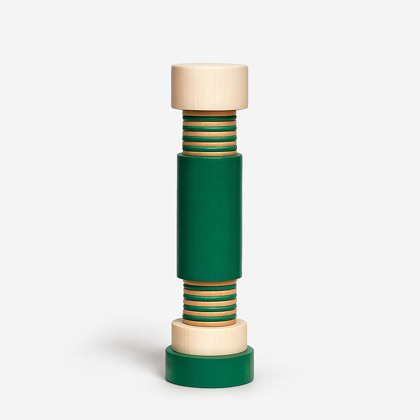 MP0215 — мельница для соли, перца и специй. Корпус из клёна с акцентами зелёного цвета. Дизайн — Этторе Соттсасс (Ettore Sottsass), 1989 год.