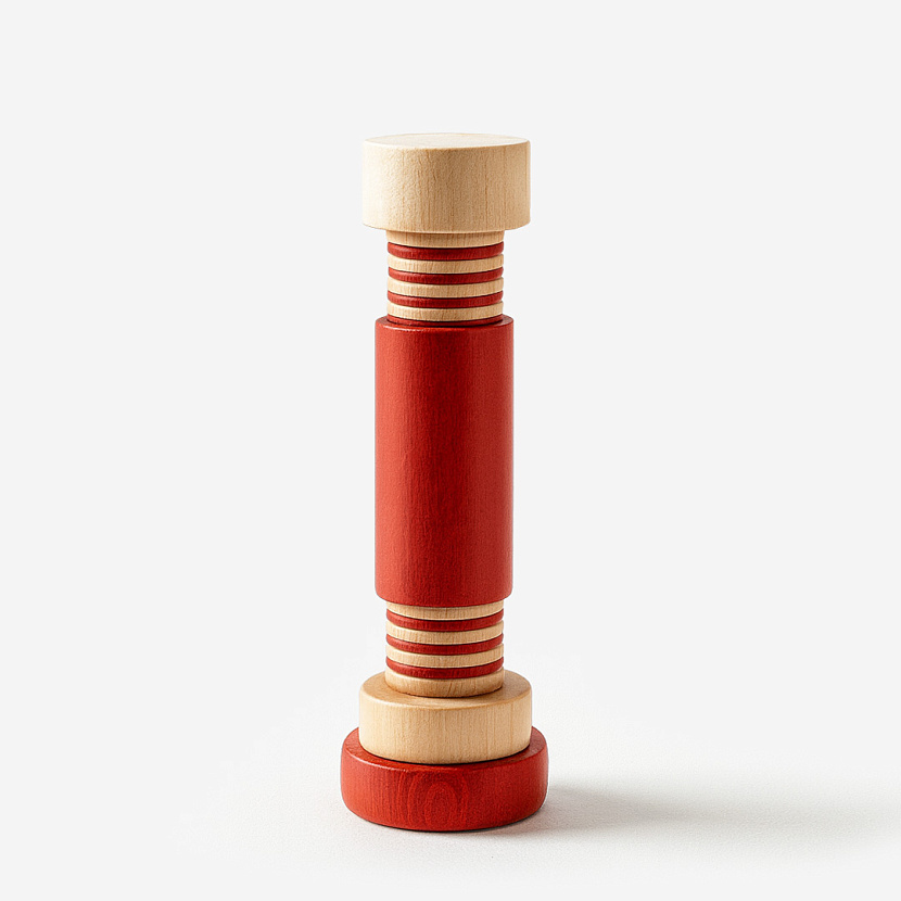 MP0215 — мельница для соли, перца и специй. Корпус из клёна с акцентами красного цвета. Дизайн — Этторе Соттсасс (Ettore Sottsass), 1989 год.