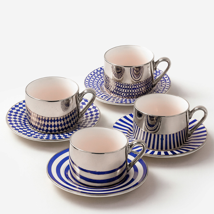 Четыре кофейные пары Aunty от Pols Potten. Изящный набор с блюдцами в бело-синей цветовой гамме и металлизированными чашками. Представлен в фирменной подарочной упаковке.
