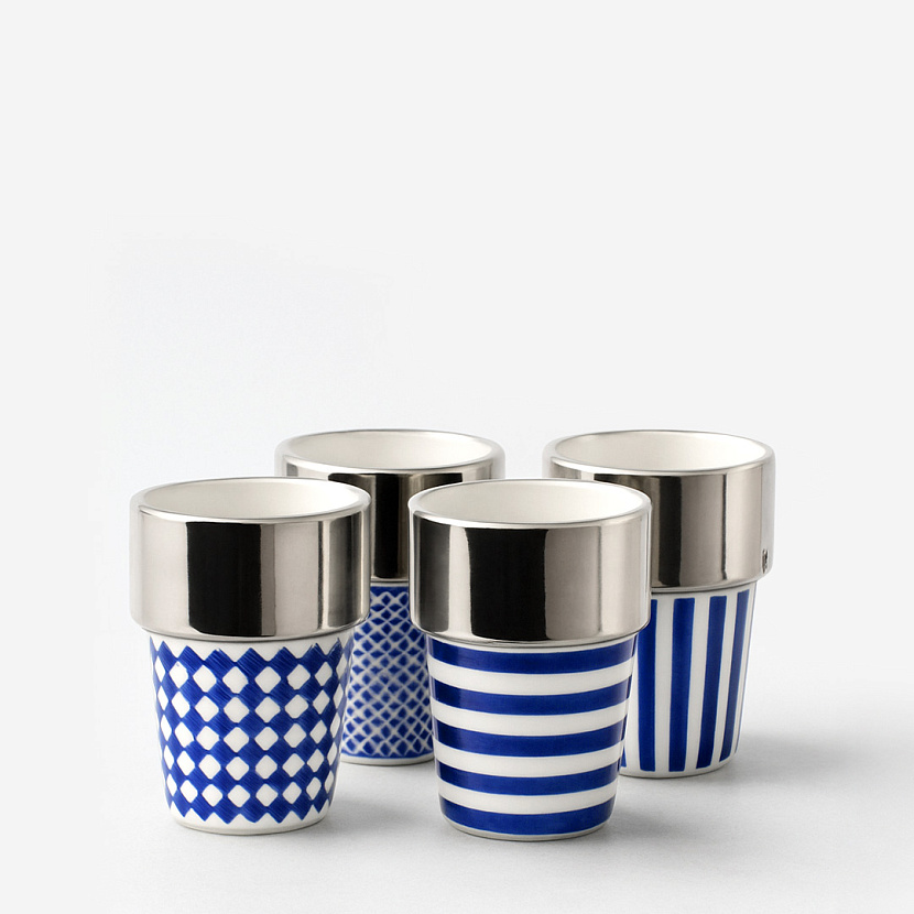 Четыре высокие кружки Aunty от Pols Potten. Изящный набор в бело-синей цветовой гамме и металлизированными элементами. Представлен в фирменной подарочной упаковке.