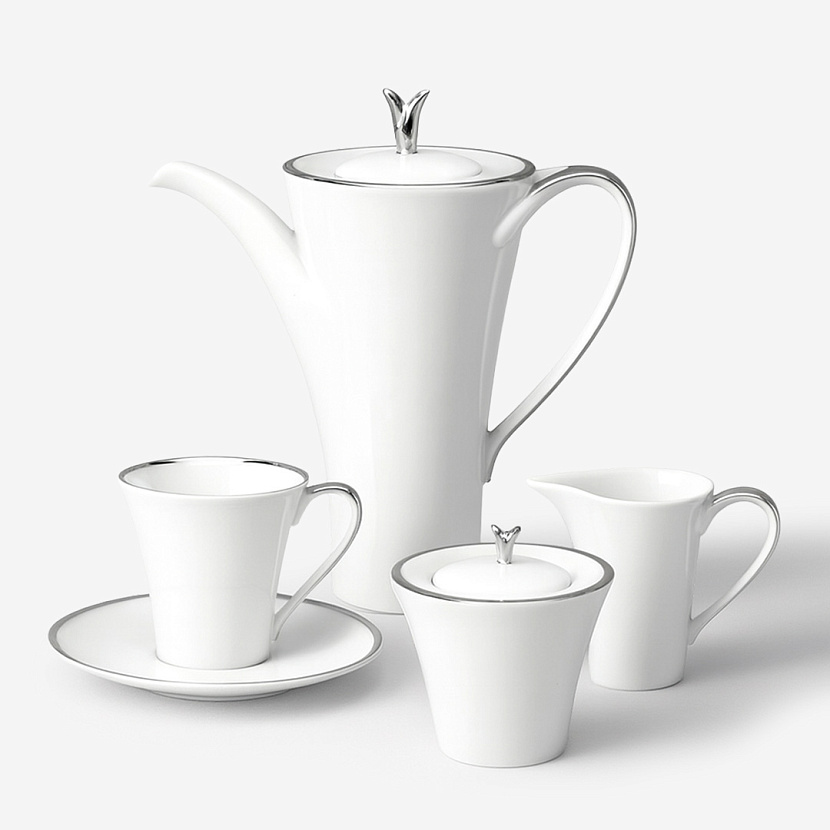 Кофейный сервиз Comet Platinum на шесть персон. Изделия из высококачественного костяного фарфора украшены окантовкой из платины. Лаконичный сервиз изготовлен и декорирован вручную мастерами компании Prouna.