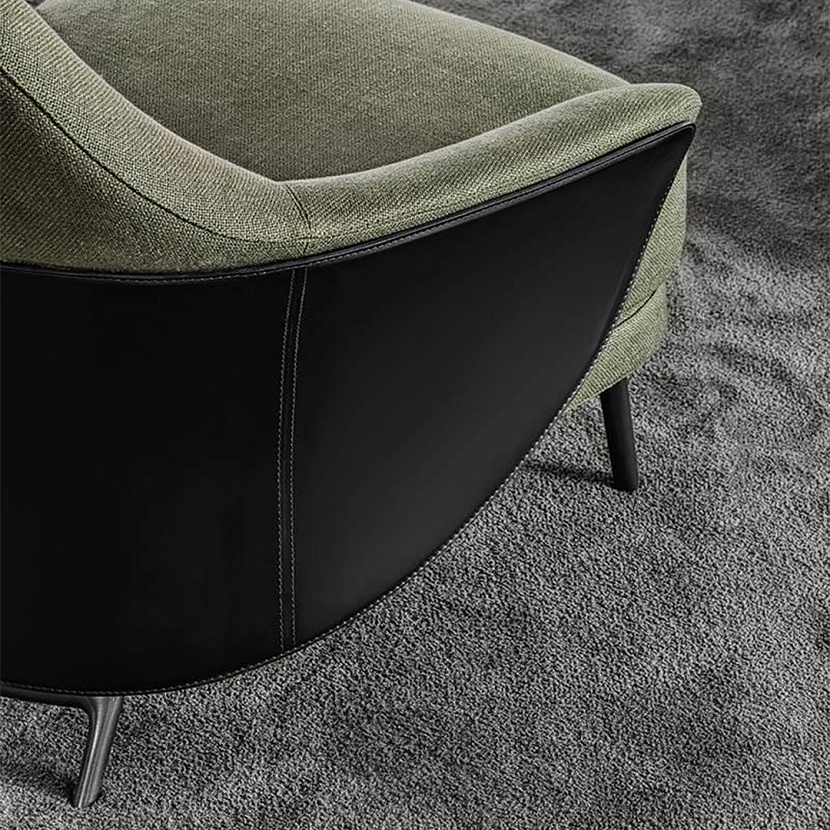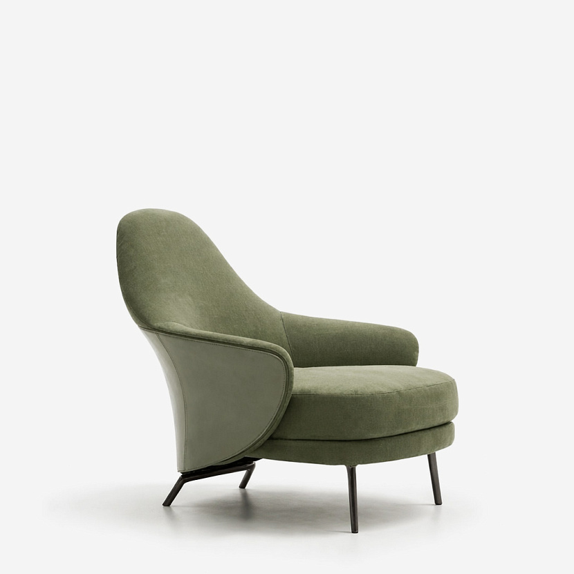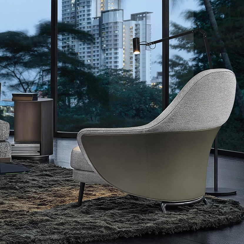 Дизайн кресла Angie, разработанный студией GamFratesi, вдохновлен идеей контраста. За очевидной простотой конструкции стоит сложный технологический процесс, в котором особое внимание уделяется материалам высокого качества. Добавив кожаный элемент, дизайнерам удалось подчеркнуть изогнутые линии кресла. Серия Angie включает в себя кресло с пуфом и кресло для отдыха в различных цветовых комбинациях и материалах.