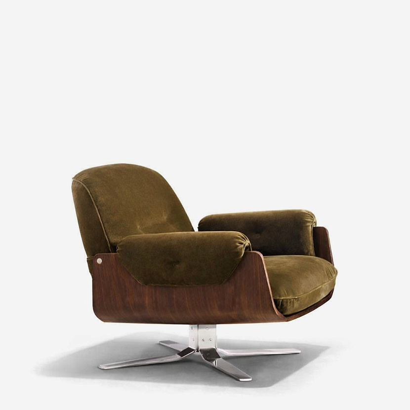 Кресло Laurel отличается выразительным силуэтом и мягкой архитектурной формой. Деревянная оболочка плавно поднимается, формируя подлокотники и поддерживая объемные подушки сиденья и спинки. Модель вдохновлена эстетикой mid-century и дополнена характерной декоративной лентой на спинке с металлическими элементами, подчеркивающими мастерство отделки и скульптурную выразительность дизайна.