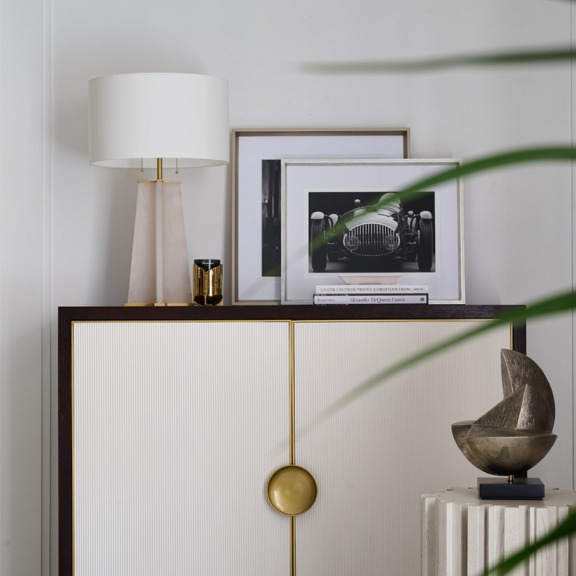 Комод Odeon с корпусом из дуба и отделкой из окрашенных в светлый цвет деревянных панелей, модель дополняет акцентная латунная фурнитура. Дизайн вдохновлён французской мебелью 30-х годов прошлого века. Дизайнер — Томас Физант (Thomas Pheasant).