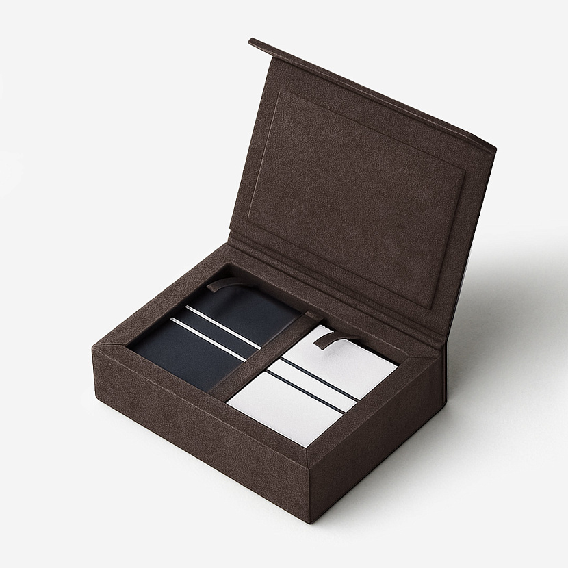 Игральные карты Parma в замшевом боксе серого цвета (оттенок «lava»). В набор входят две колоды. Магнитная защёлка обеспечивает особое удобство при эксплуатации.