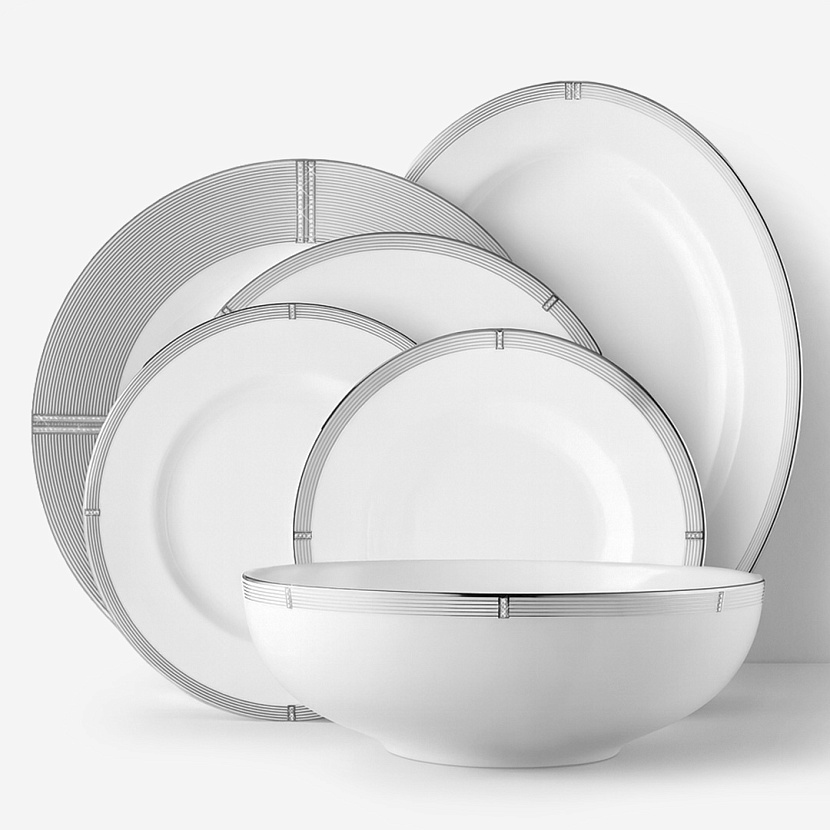 Обеденный сервиз Regency Platinum на шесть персон. Изделия из высококачественного костяного фарфора украшены платиновой окантовкой и кристаллами Swarovski. Сервиз изготовлен и декорирован вручную мастерами компании Prouna.