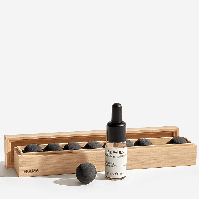 Диффузор, созданный в сотрудничестве с креативной студией Be My Guest, представляет собой девять сфер из спрессованной корейской почвы с добавлением угля. В набор также входит парфюмерное масло. Аромат St. Pauls наполнен древесными нотами кедра, сандала и бодрящего лемонграсса.