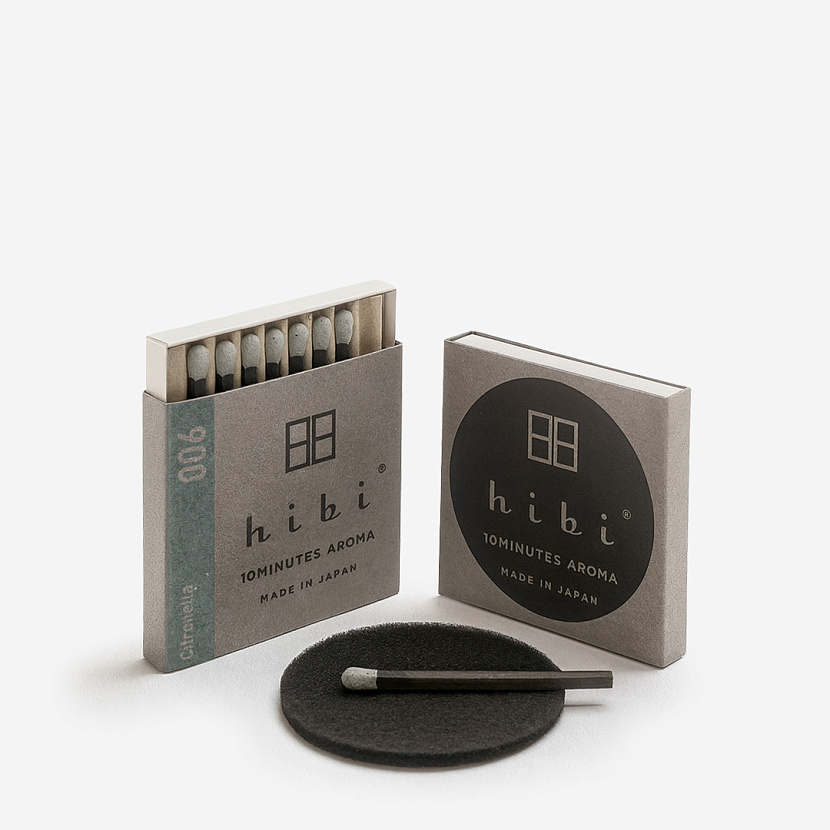 Набор для ароматерапии Citronella в дорожном формате от японского бренда Hibi. В набор входит коробок, 8 ароматических спичек, пропитанных эфирным маслом цитронеллы, и специальный огнеупорный коврик, благодаря которому можно зажечь благовоние прямо внутри коробочки.