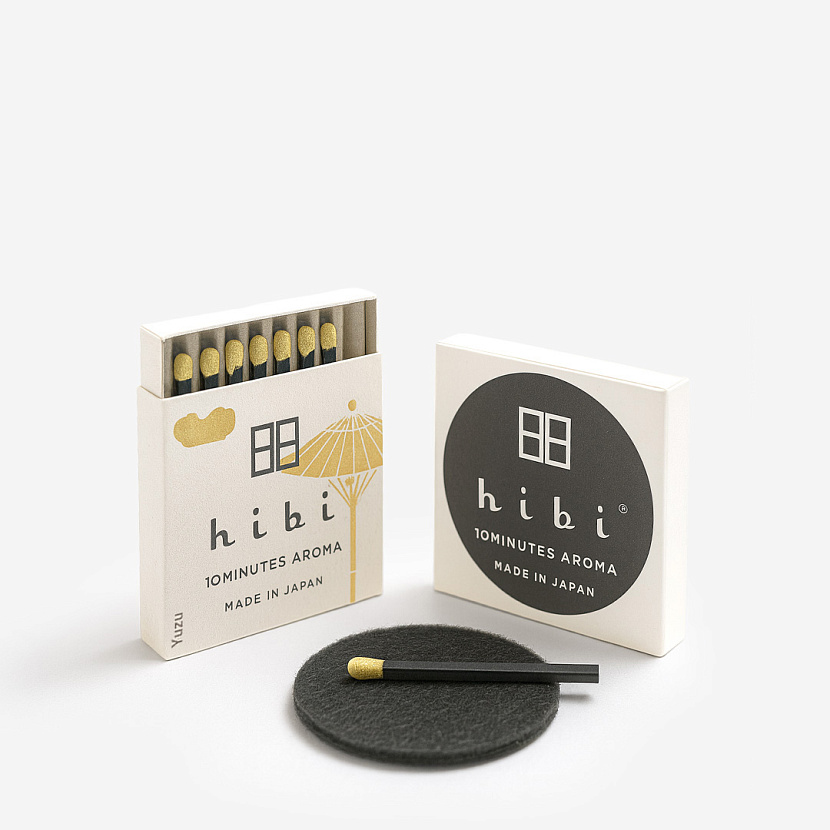 Набор для ароматерапии Yuzu в дорожном формате от японского бренда Hibi. В набор входит коробок, 8 ароматических спичек, пропитанных эфирным маслом юдзу, и специальный огнеупорный коврик, благодаря которому можно зажечь благовоние прямо внутри коробочки.
