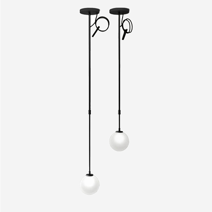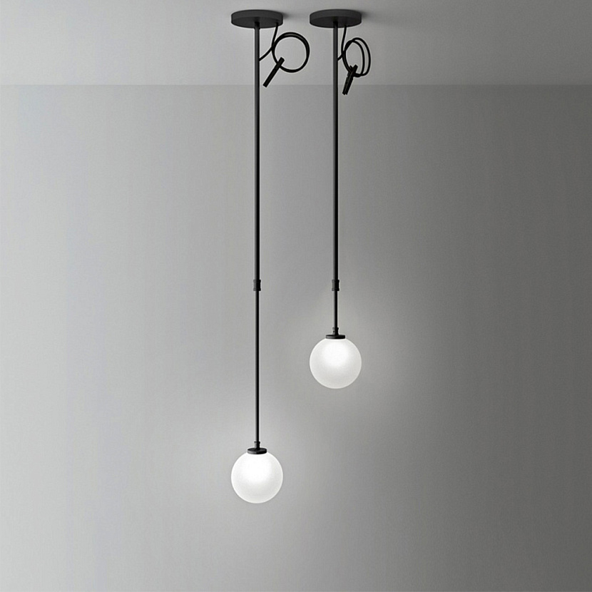 Boccia — модель светильника в подвесной версии. Телескопическое основание подвесных светильников изготавливается из анодированного алюминия с чёрным матовым покрытием. Отрегулировав нужное положение, вы можете закрепить оставшийся шнур стильным зажимом, входящим в комплект.