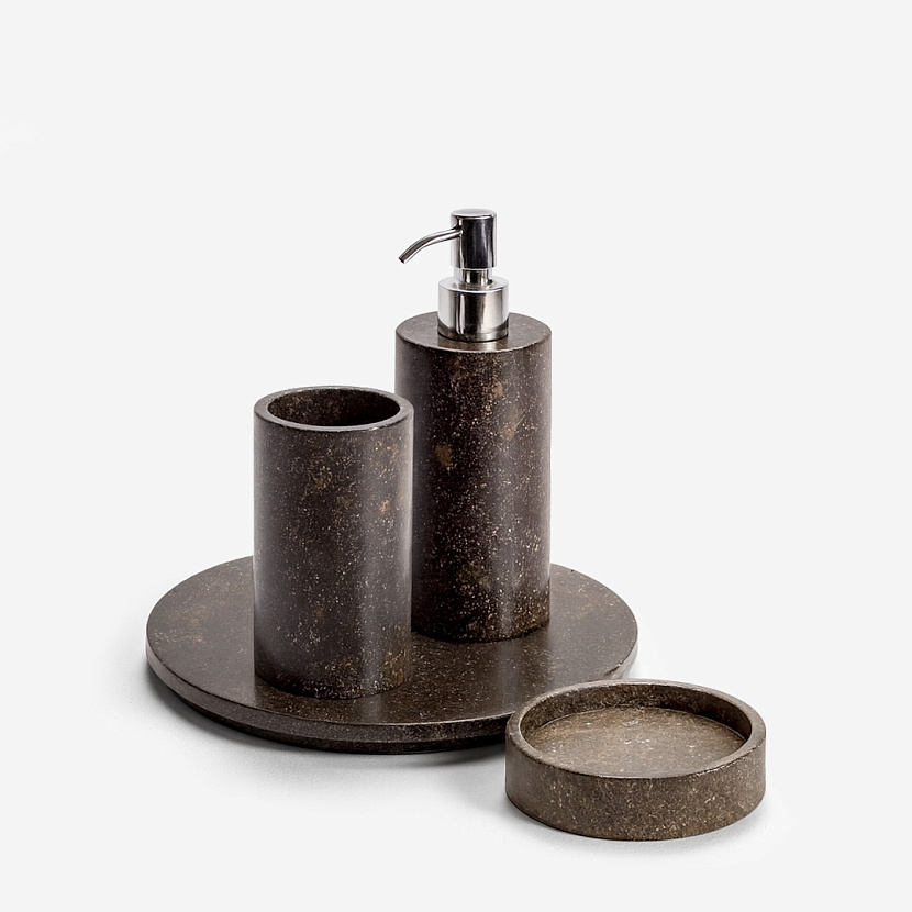 Набор аксессуаров для ванной комнаты Aragona от итальянского бренда Room. В комплект входят четыре предмета из известнякового камня Sicily Pitch: диспенсер для мыла, мыльница, стакан для зубных щёток и поднос.