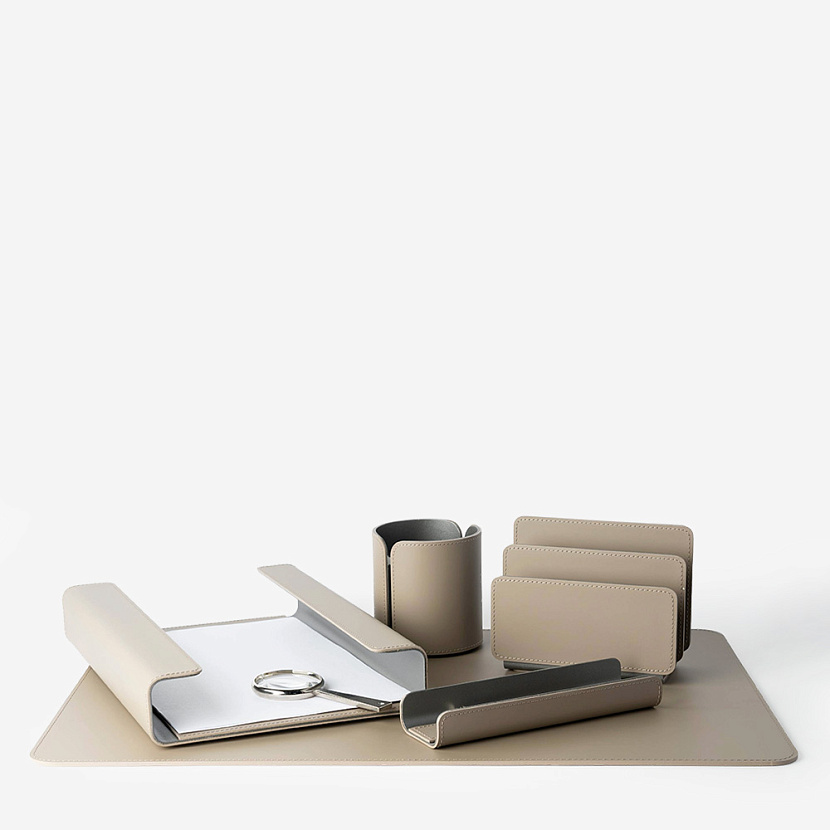 Пять предметов в комплекте: планшет, подставка для писем, стакан для ручек, лоток для бумаг и мелочница. Элегантное решение для организации пространства на столе.