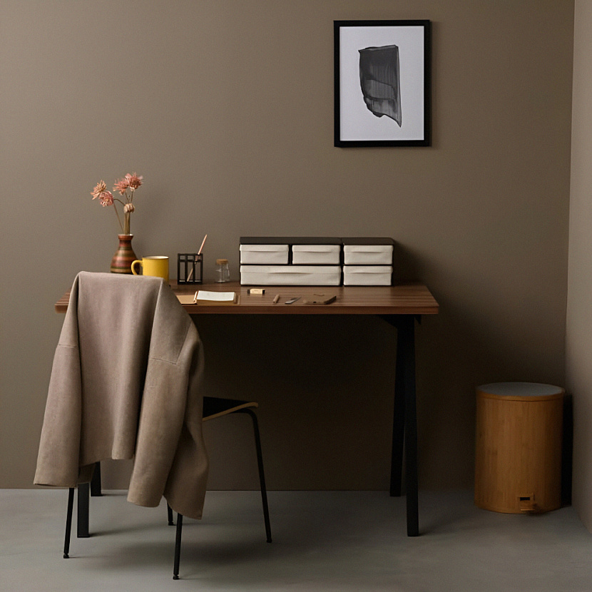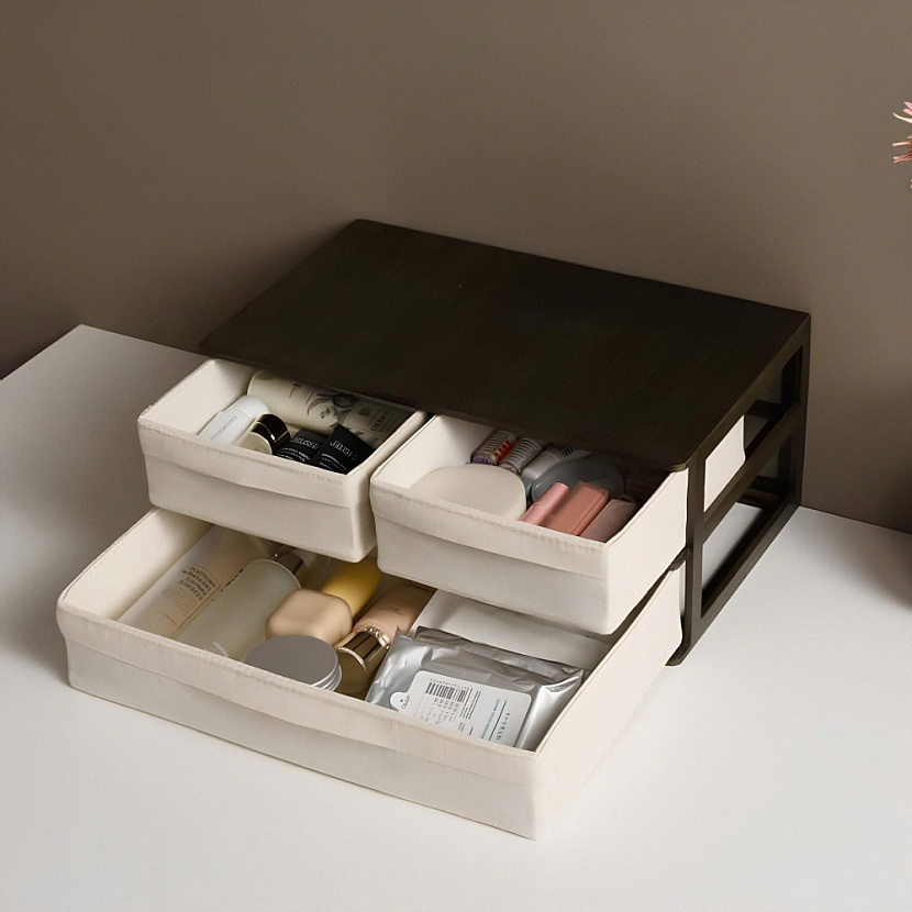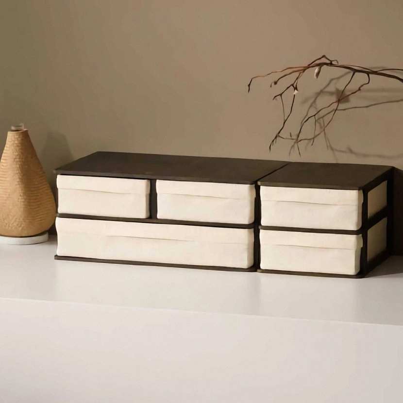 Настольный органайзер Ree с тремя выдвижными ящиками. Изготовлен из натурального бамбука, окрашенного в коричневый, ящики — из ткани. Решение отлично подойдёт для организации хранения в ванной, спальне или других пространствах дома. Произведено на Тайване.