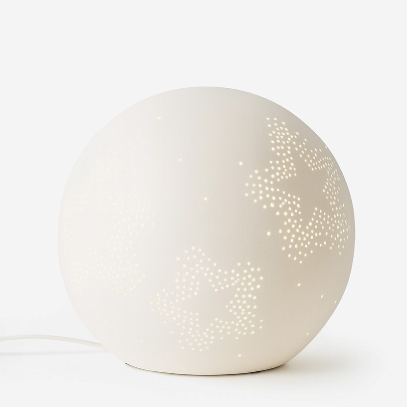 Новогоднее украшение — белоснежный светящийся шар с перфорацией в виде звезд.