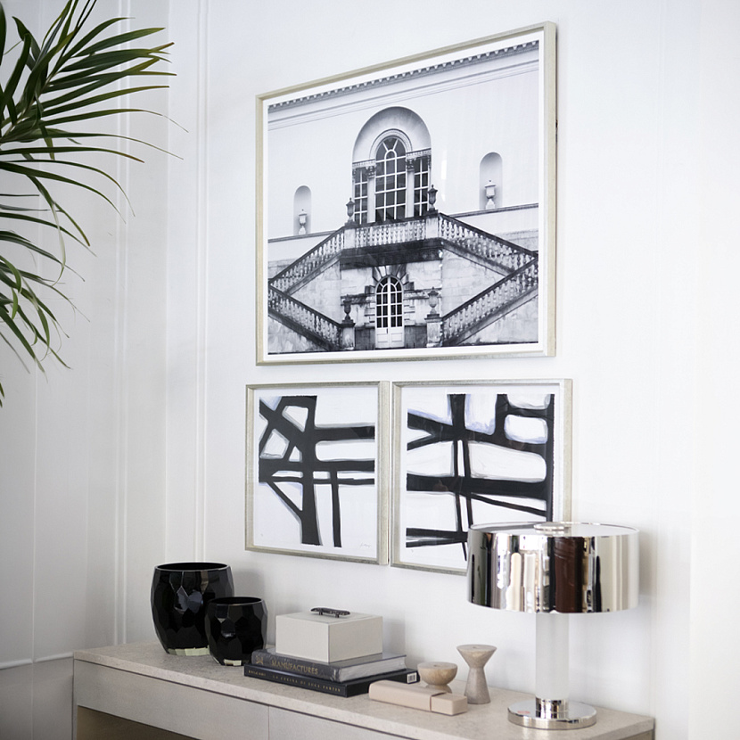 Постер с чёрно-белым изображением летнего дворца, возведённого в британском поместье Чизик в 1720-е годы. Оформлено в лаконичную деревянную раму серебряного цвета.