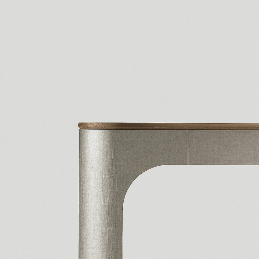 Система основана на алюминиевой несущей раме с характерным профилем и тонкими пропорциями. Столешницы выполняются из закалённого стекла или дерева и формируют строгую геометрию, подчеркивающую минималистичную конструкцию и точность соединений.