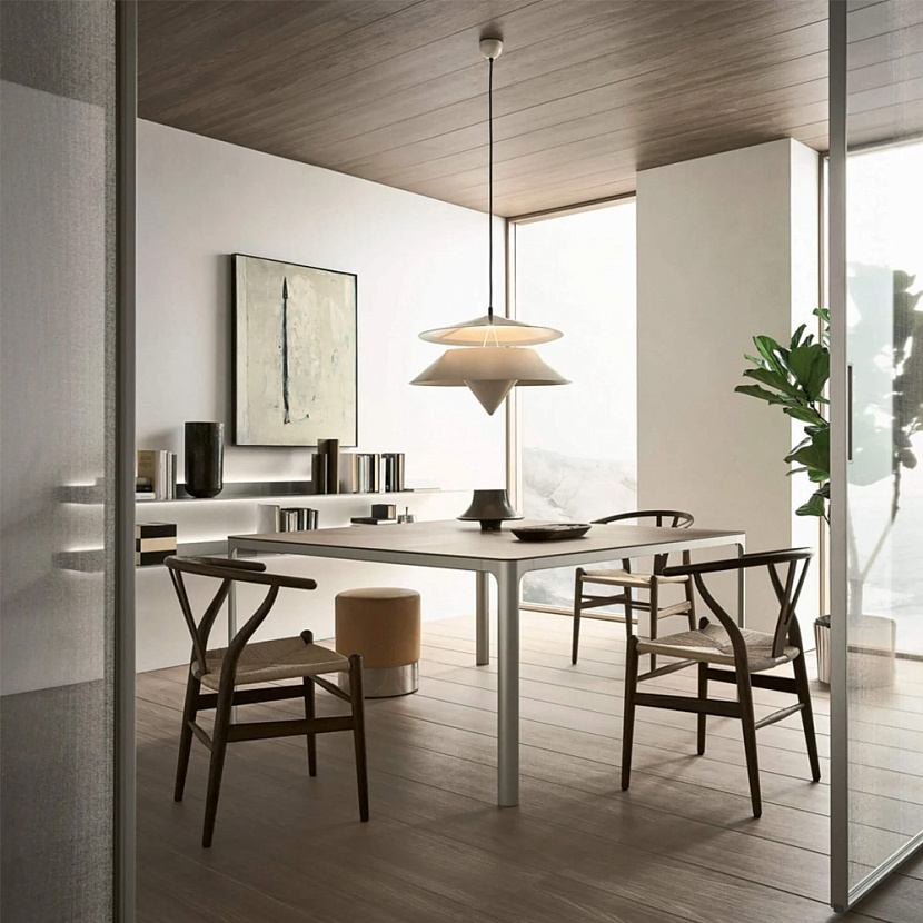 Flat интегрируется в интерьеры жилых и общественных пространств, где требуется лаконичный стол с лёгкой архитектурной конструкцией и широкой вариативностью размеров.