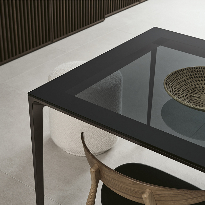 Конструкция стола основана на алюминиевой несущей раме с характерными опорами и утопленной системой крепления столешницы. Такая структура формирует визуально лёгкий профиль столешницы и подчёркивает точность пропорций всей конструкции.