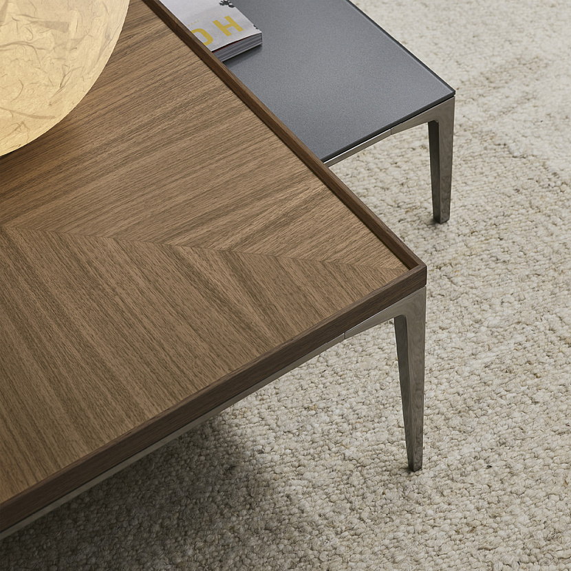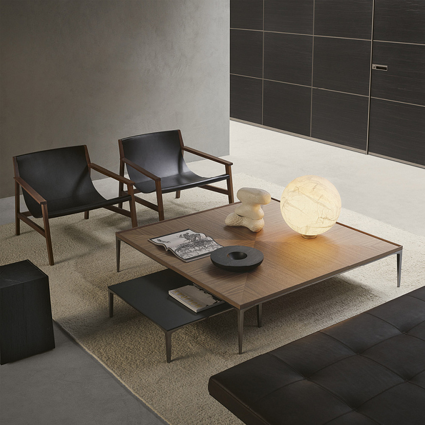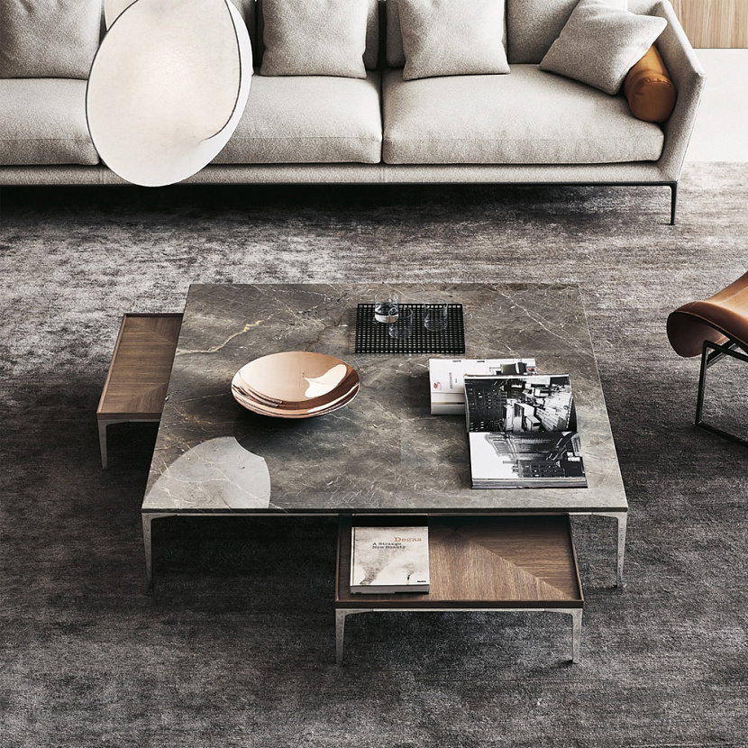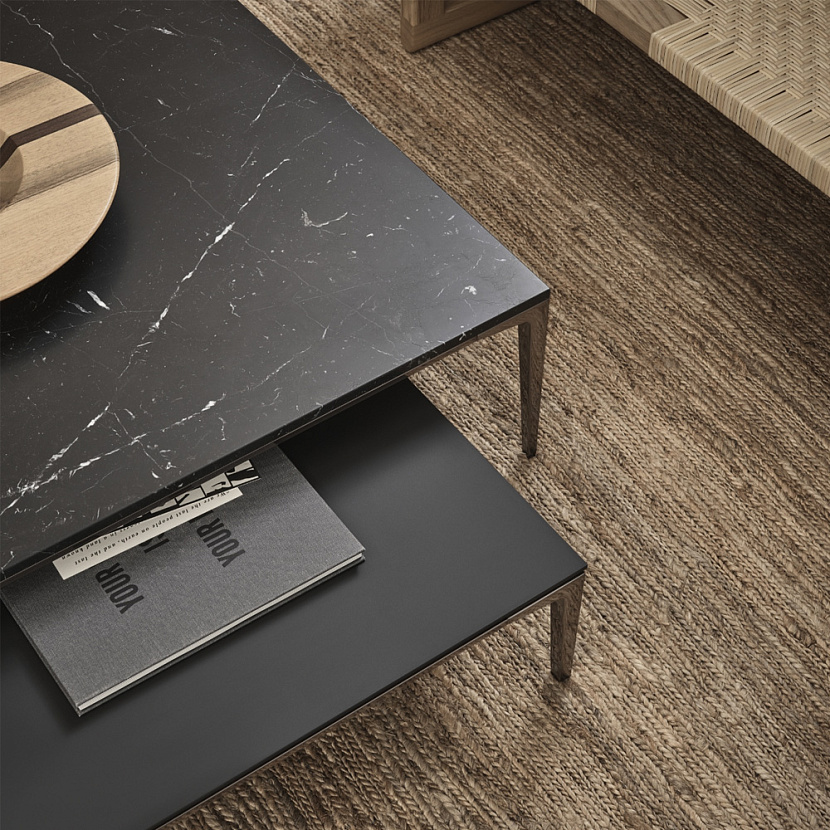 Различные размеры и высоты позволяют комбинировать столы между собой, создавая многослойные композиции в пространстве. Система подходит как для одиночного использования, так и для группировки в зоне гостиной.