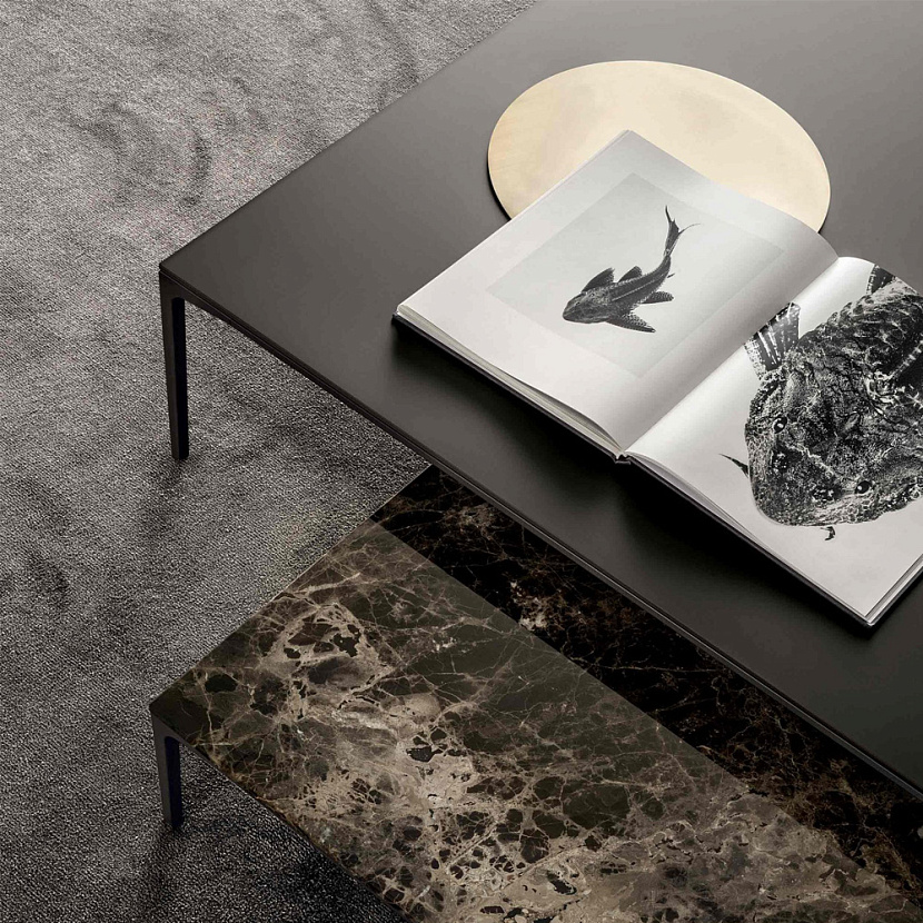 Журнальный стол с каркасом из алюминия и съёмной столешницей. Столешницы выполняются из лакированного стекла (Ecolorsystem), дерева или мрамора. Толщина столешницы: стекло — около 6 мм, дерево — около 25 мм, мрамор — около 15 мм.