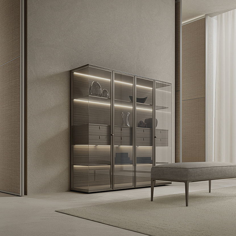 Тщательная проработка деталей и технические инновации превосходно воплотились в новом 4-створчатом исполнении шкафа Aliante, предназначенного для хранения и демонстрации ценных предметов в зоне гостиной. Контейнер напоминает драгоценную шкатулку из прозрачного стекла, в которой внутренние элементы поддерживаются искусно скрытой конструкцией: стеклянные полки и деревянные выдвижные ящики выглядят как подвешенные в воздухе. Конструкция 4-дверного исполнения сделана из ореха и бронзы: дверцы выполнены из светлого отражающего стекла, а полки – из серого прозрачного стекла. Внутренняя поверхность ящиков и столешница комода обтянуты искусственной кожей 8 расцветок.