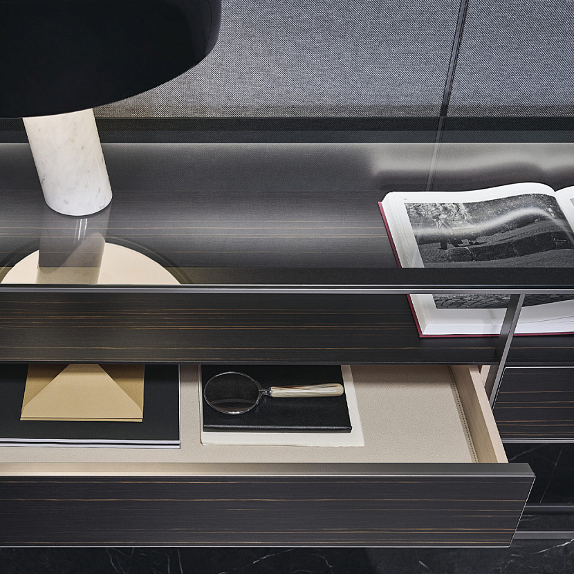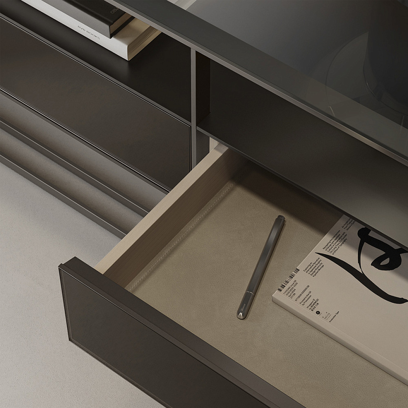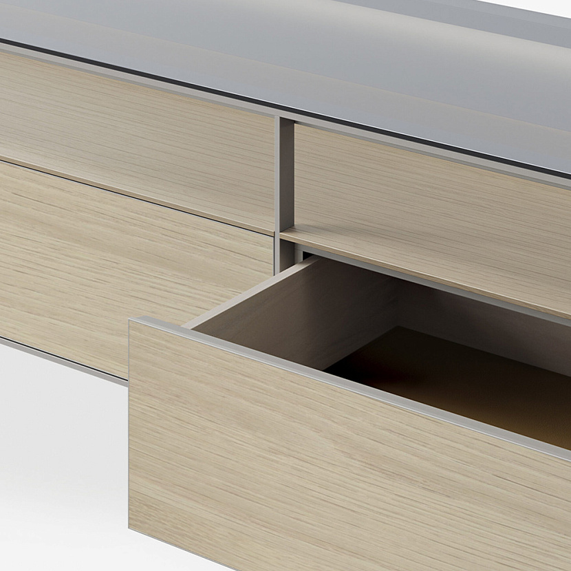 Фасады ящиков имеют бесшовную алюминиевую рамку, выполненную методом сгибания профиля. Внутренние поверхности выполнены из светлого дерева, а дно ящиков отделано экокожей. Стеклянная столешница подчёркивает лёгкость конструкции и усиливает визуальную чистоту композиции.