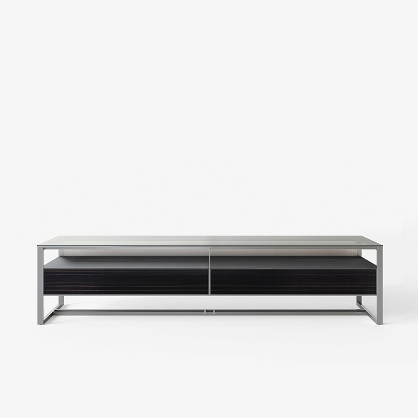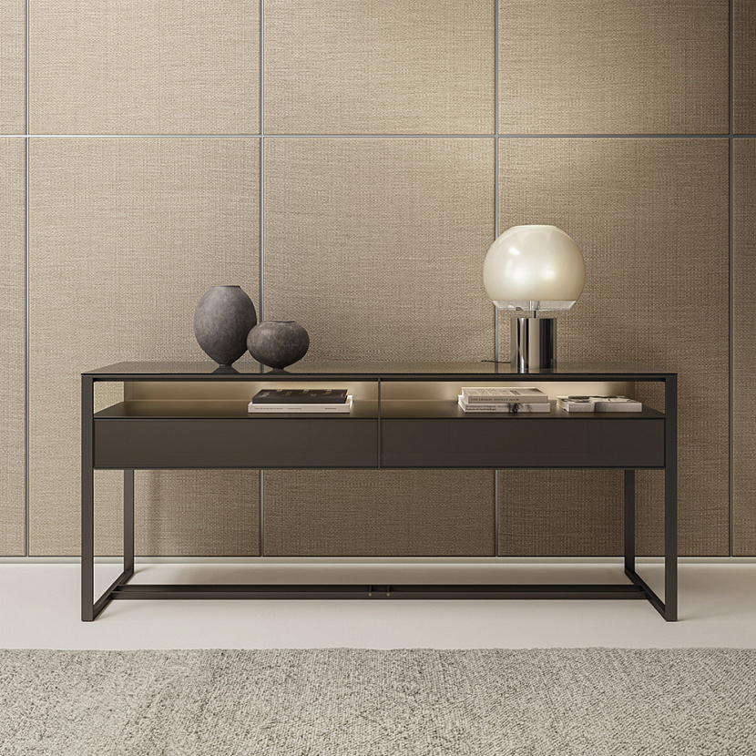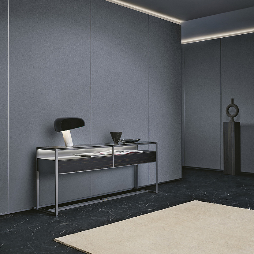 Консоль входит в коллекцию Rialto и отличается характерной конструкцией алюминиевого каркаса, формирующего строгую геометрию и визуально «подвешивающего» центральный блок ящиков. Такая структура создаёт ощущение лёгкости и прозрачности предмета, сохраняя при этом чёткую архитектурную графику.