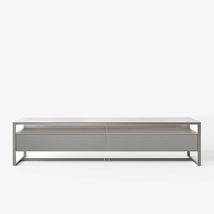 Элемент входит в коллекцию Rialto и построен на характерной алюминиевой рамной структуре, формирующей архитектурный «мост» — конструктивный элемент, визуально отделяющий центральный объём хранения от основания и столешницы. Такая композиция создаёт ощущение лёгкости предмета и подчёркивает строгую геометрию мебели.