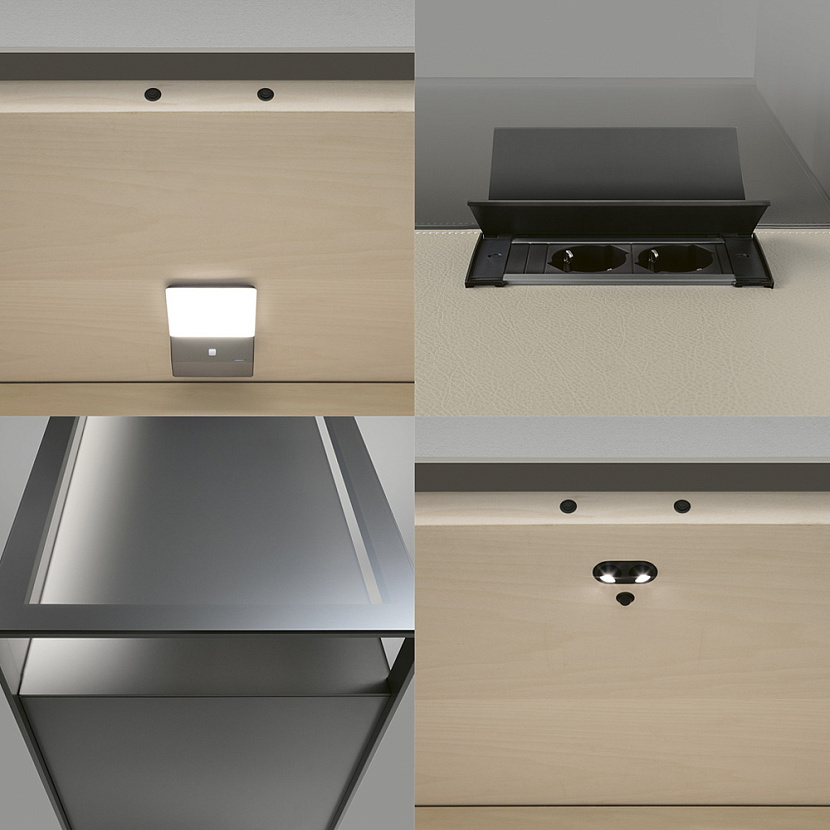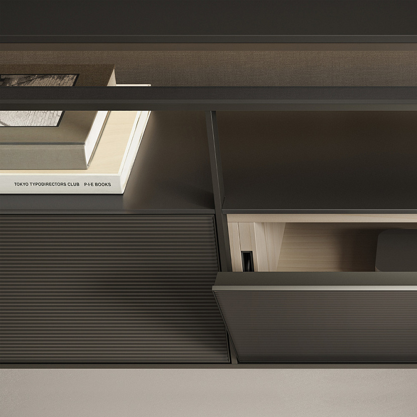 Центральный корпус включает выдвижной ящик и откидную дверцу с отделением для размещения медиаприставок и сопутствующей техники. Стеклянная столешница и алюминиевые профили формируют цельную композицию, объединяющую хранение и технологические элементы в единую архитектурную поверхность.