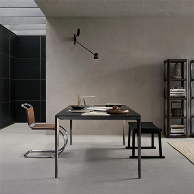 Система является развитием стола Flat и основана на конструкции из экструдированного алюминия со столешницами из стекла или других материалов коллекции. Архитектура строится на линейных и угловых композициях с возможностью формирования рабочих станций с боковыми и торцевыми поверхностями.