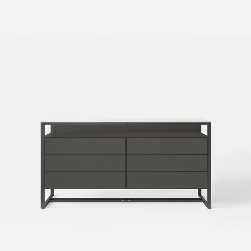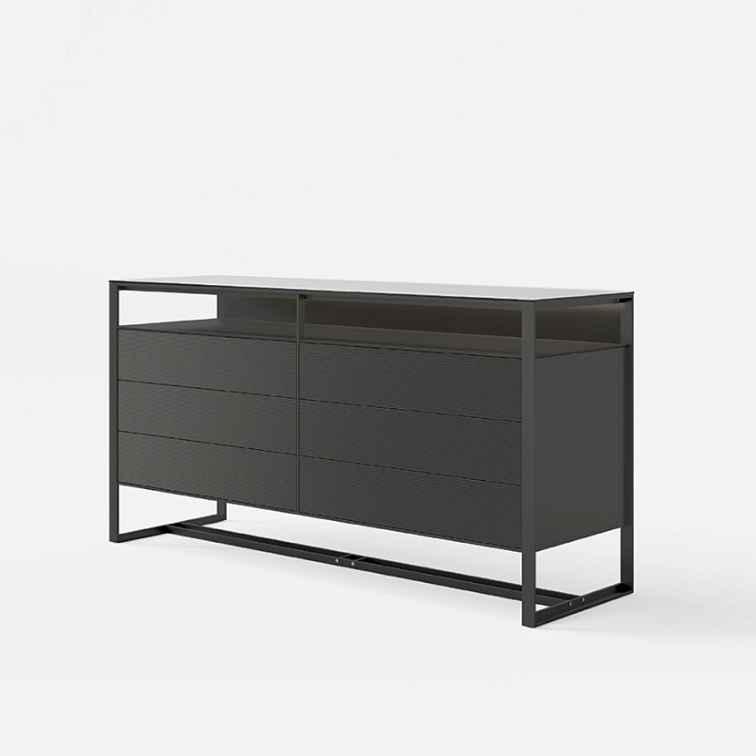 Комод с алюминиевой рамной структурой и корпусом хранения с выдвижными ящиками.