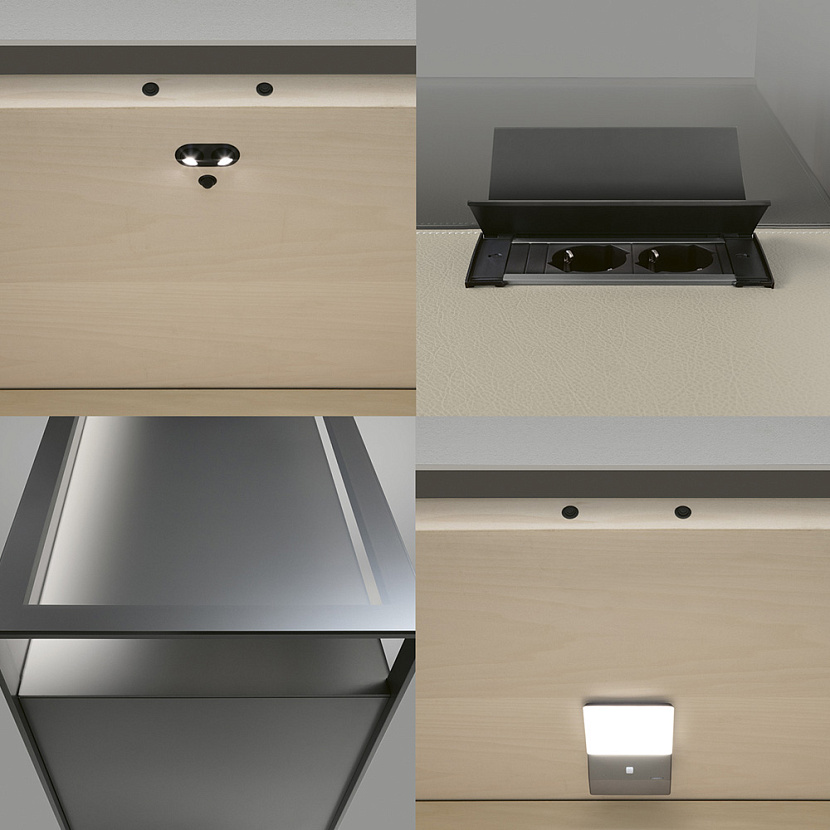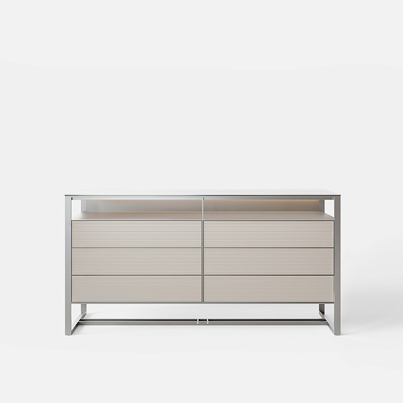 Комод оснащается выдвижными ящиками, внутренние поверхности которых выполнены из светлого дерева. Дно ящиков отделывается экокожей различных цветов, что подчёркивает внимание к деталям и тактильное качество материалов. Сочетание алюминия, стекла и дерева формирует цельную архитектурную композицию мебели.