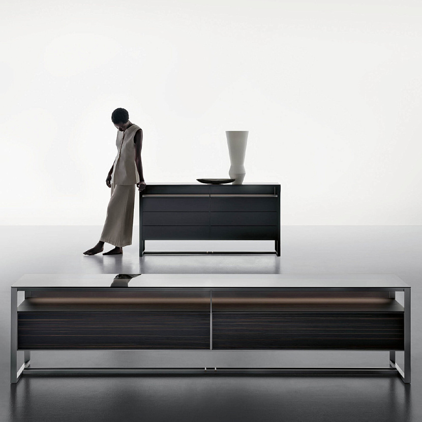 Комод Rialto интегрируется в интерьеры мастер-спален и гардеробных, где требуется компактная система хранения с минималистичной архитектурной геометрией.