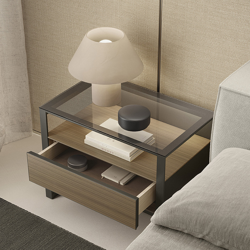 Rialto Comodini интегрируются в интерьеры мастер-спален, где требуется минималистичная прикроватная тумба с выразительной архитектурной геометрией и лёгкой конструкцией.