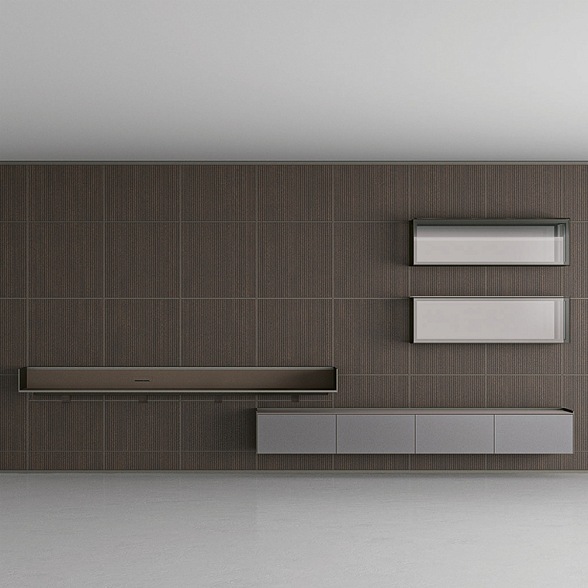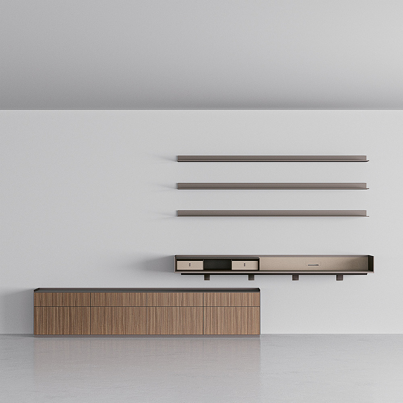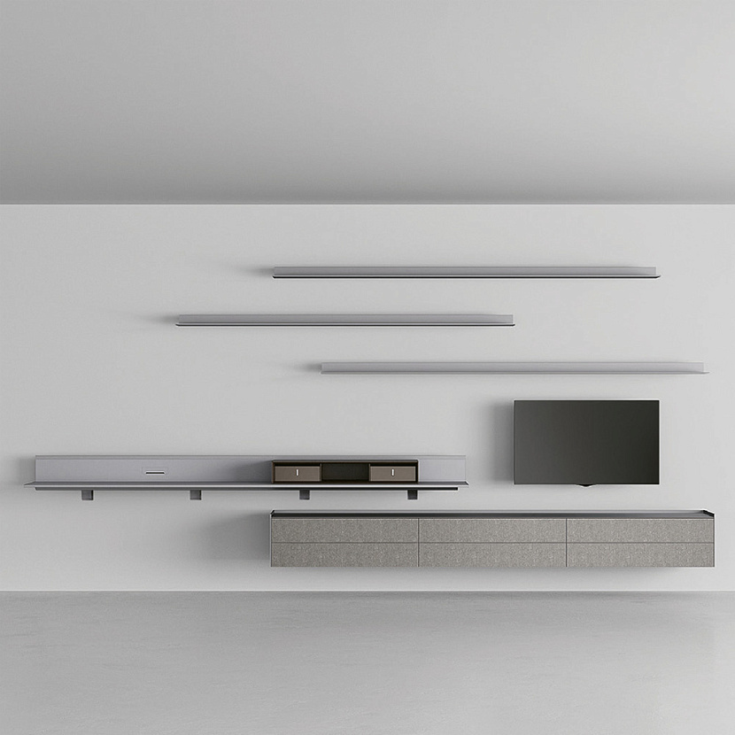 Элемент является частью модульной системы Self Plan и представляет собой подвесной стол, интегрированный в горизонтальную структуру системы. Конструкция выполнена из алюминия и основана на принципе горизонтальной модульности, благодаря чему стол может сочетаться с полками, подвесными шкафами и другими элементами хранения.