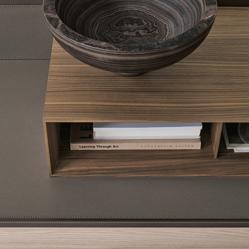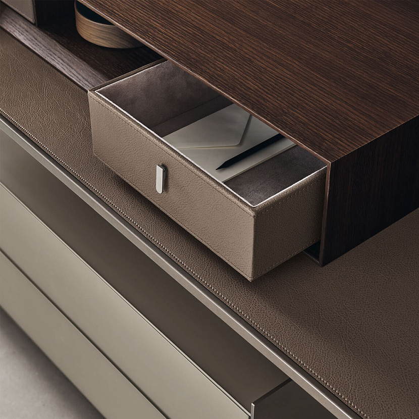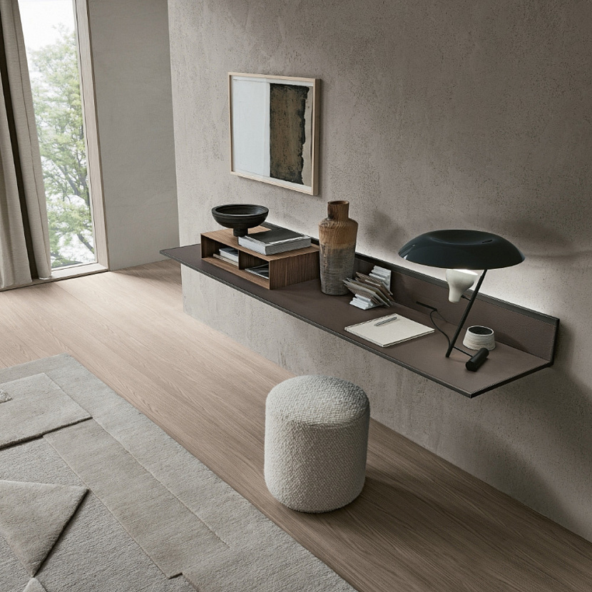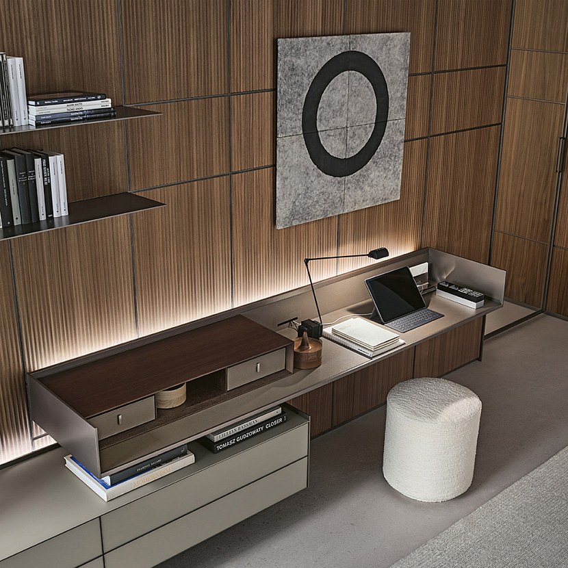 Стол Self Plan интегрируется в интерьеры гардеробных и мастер-спален, где требуется компактная рабочая зона, встроенная в систему хранения.
