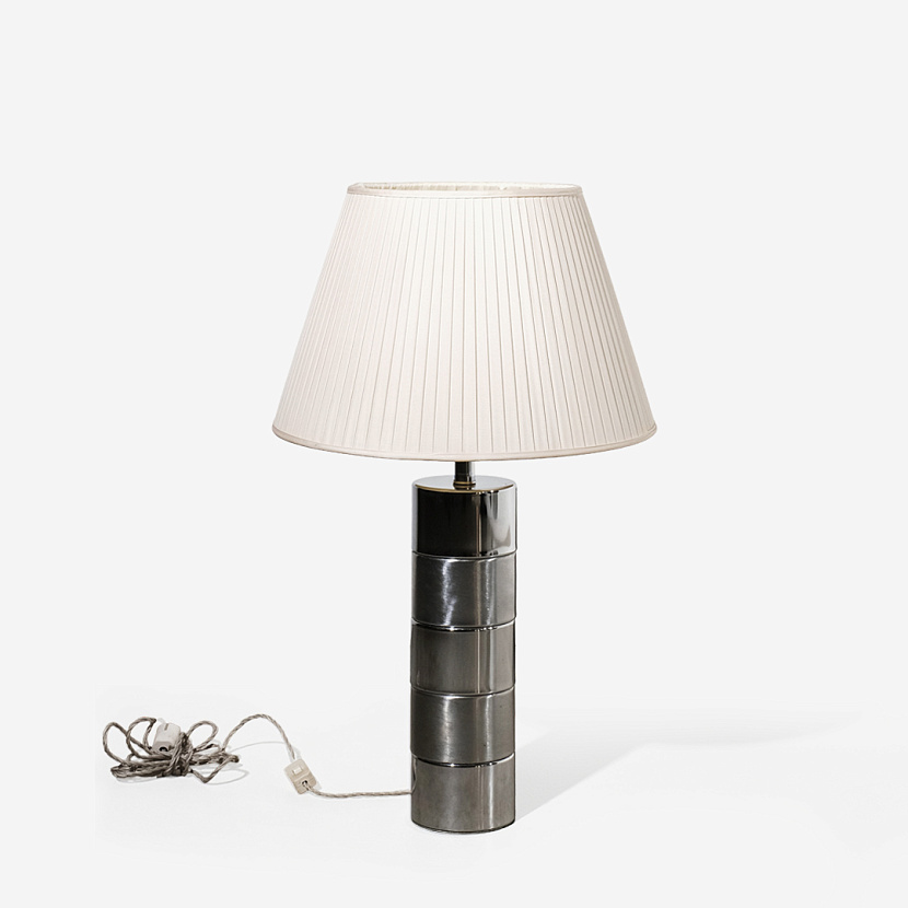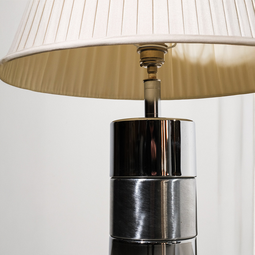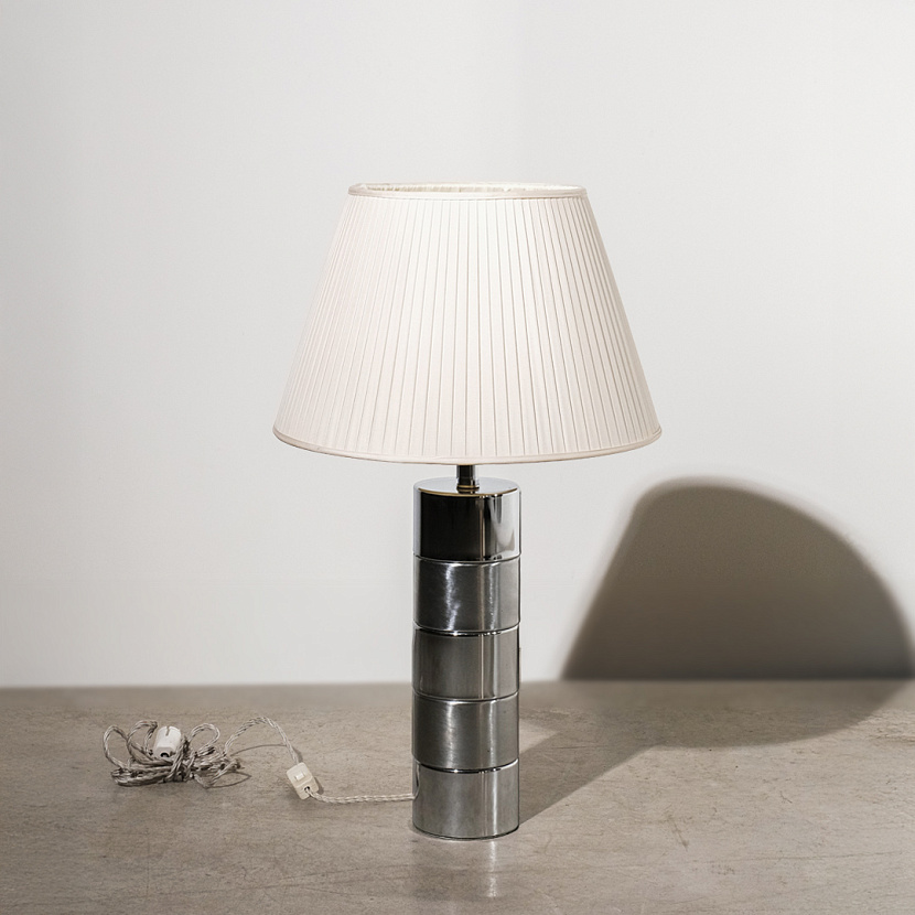 Настольная лампа середины ХХ века с основанием из никеля. Изделие дополняет шёлковый абажур.