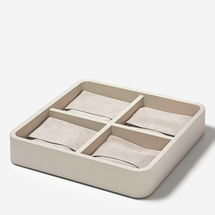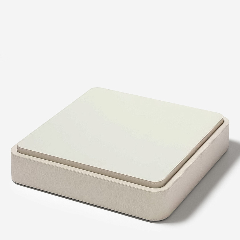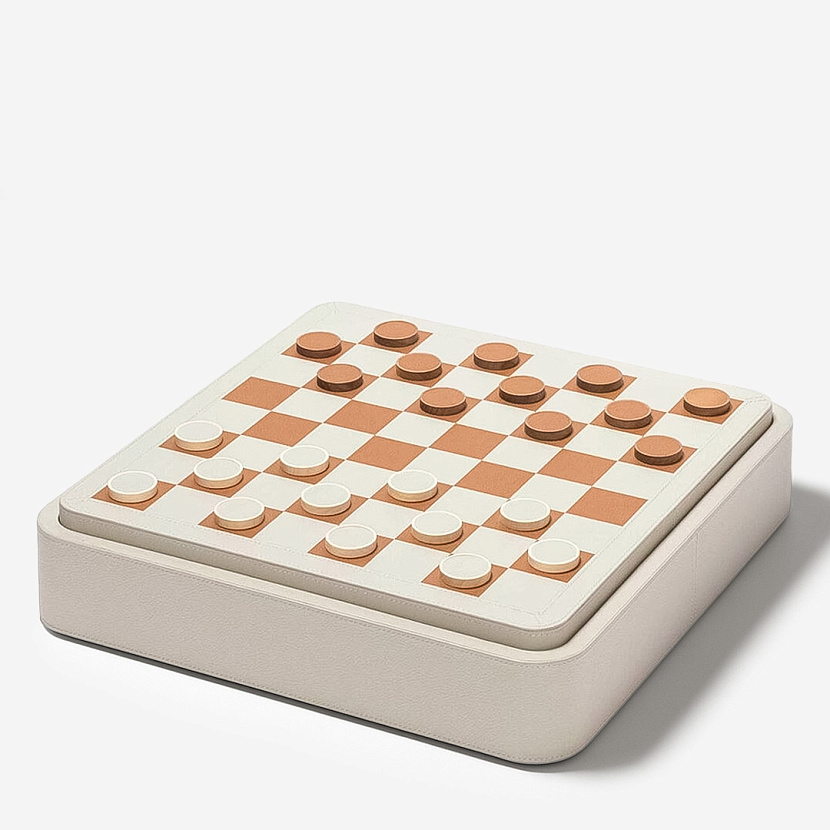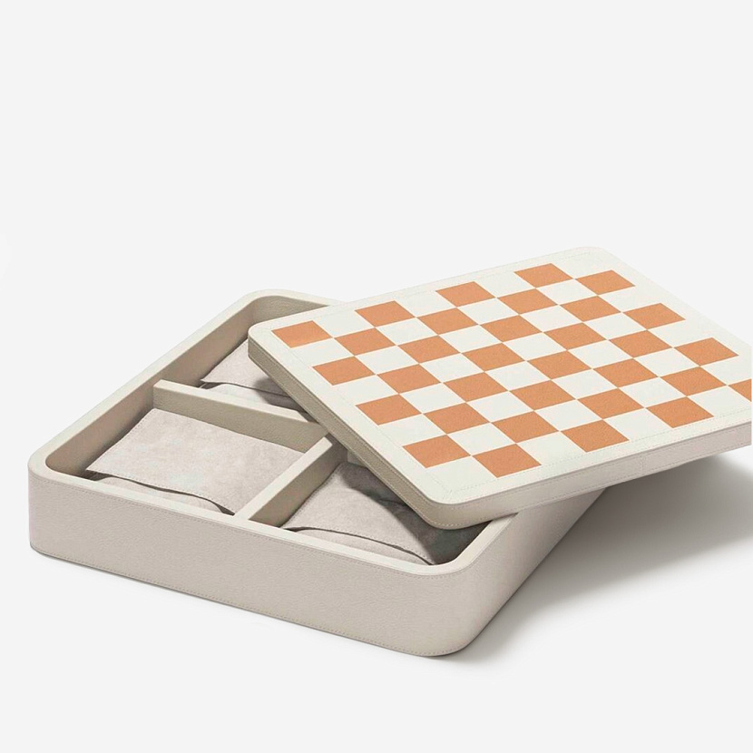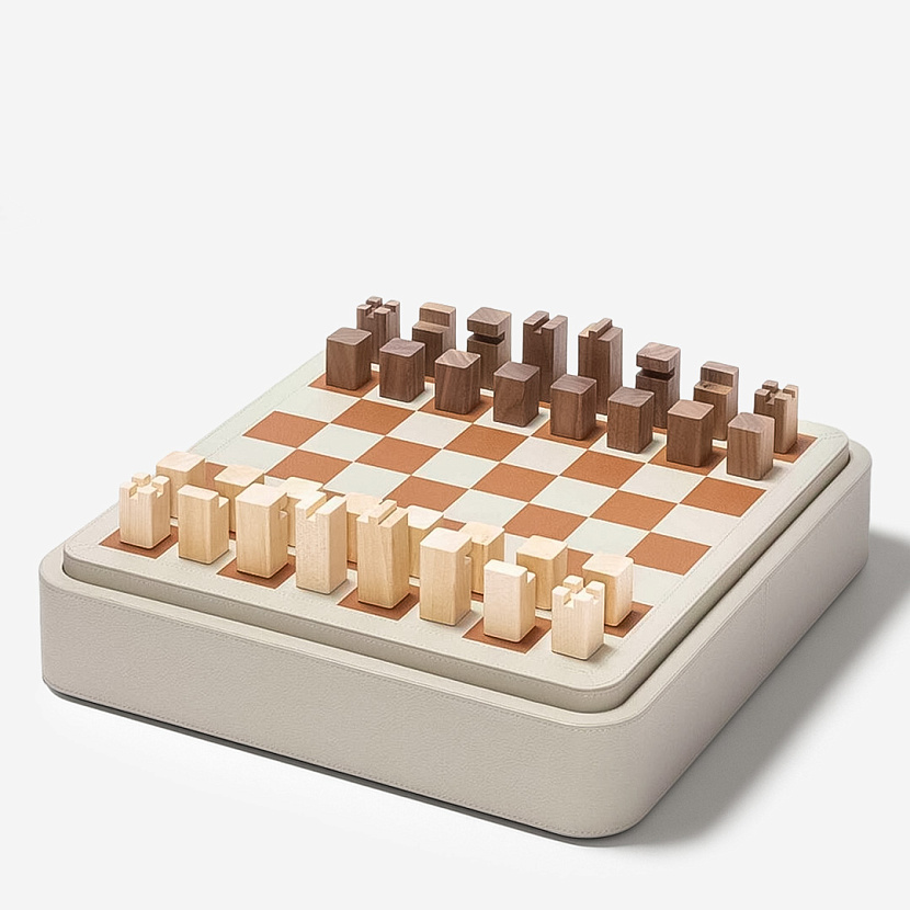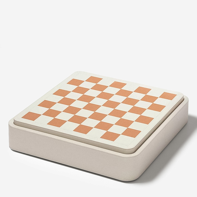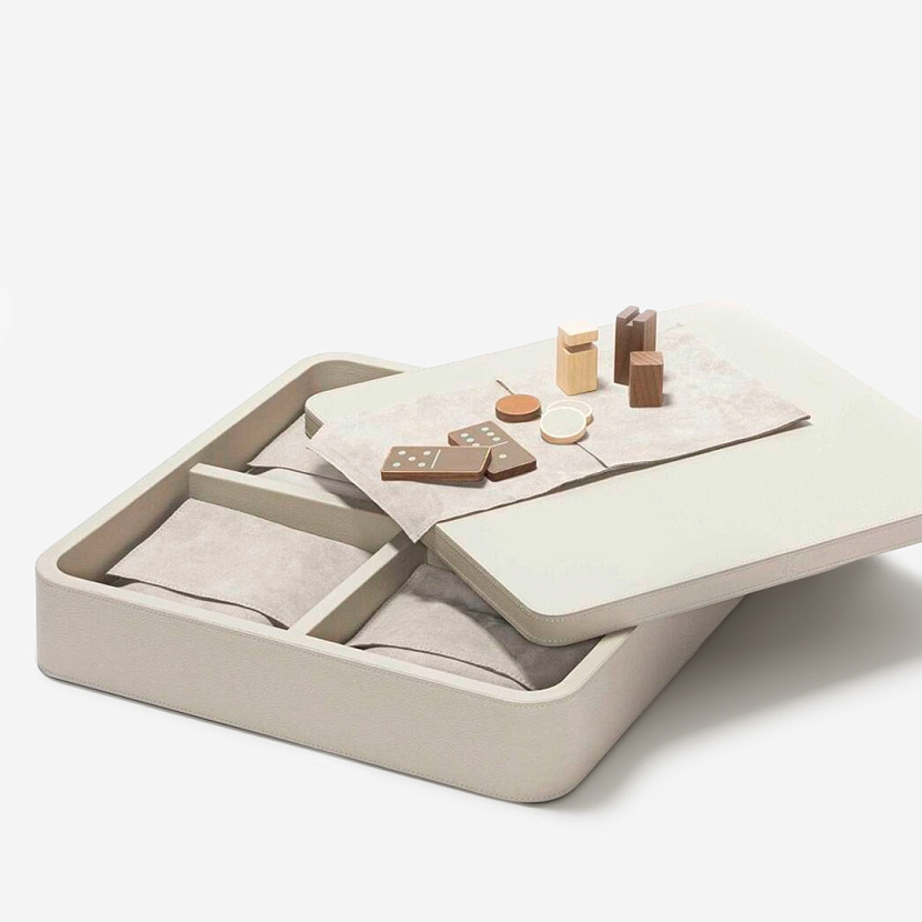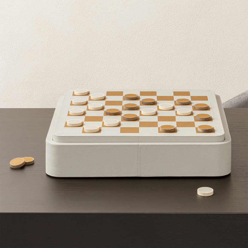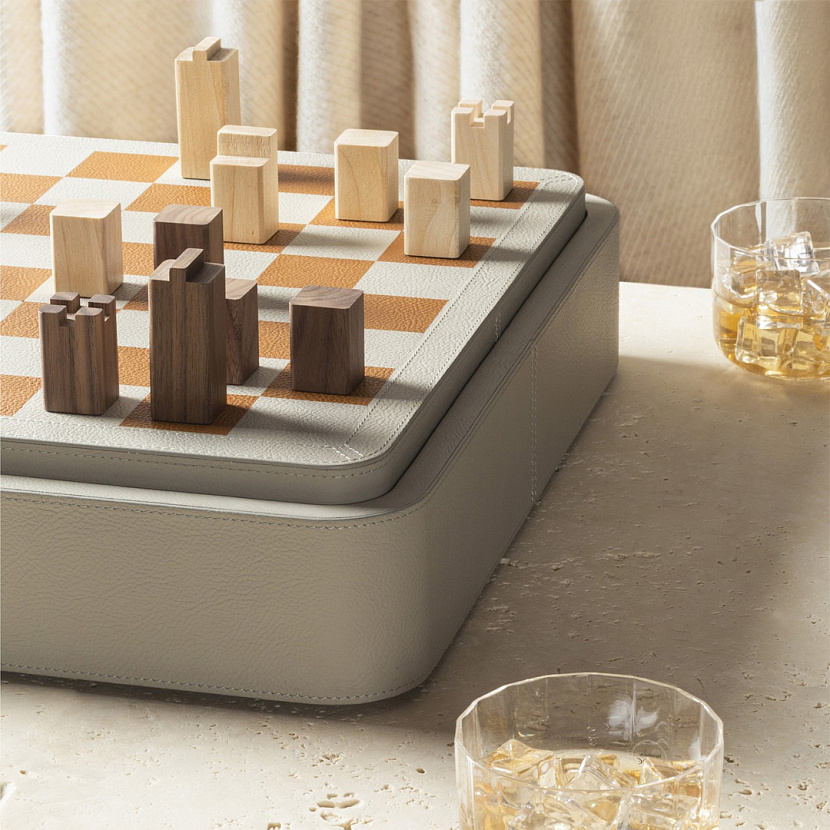 Игральный набор «3 в 1» от Giobagnara, выпущенный в коллаборации с брендом Poltrona Frau. Корпус и крышка шкатулки выполнены из древесины и обтянуты кожей в светло-бежевом оттенке. В набор входят три настольные игры — шахматы, шашки и домино. Шахматные фигуры и шашки изготовлены из клёна и ореха, домино — из ореха.