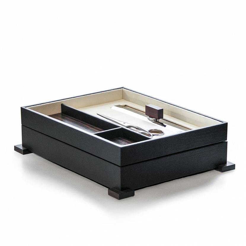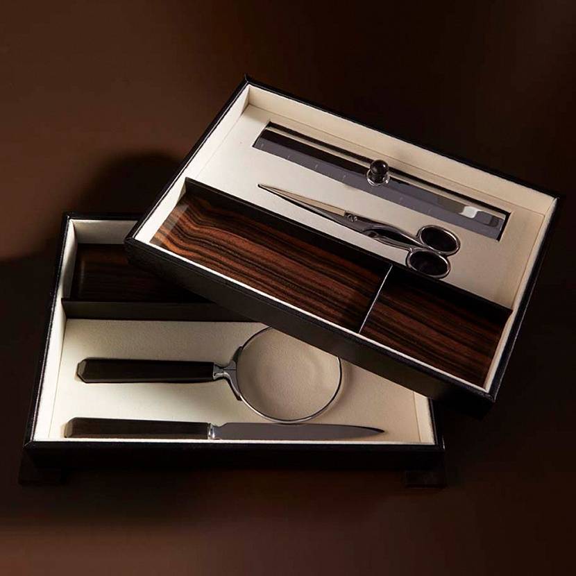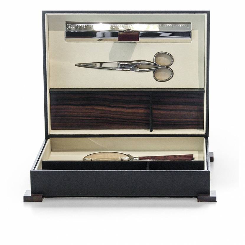 Набор письменных принадлежностей хранится в двух отделениях-подносах со вставками из эбенового дерева, что делают его своего рода органайзером для рабочего стола. В набор входят: ножницы, линейка с утяжелителем, увеличительное стекло и нож для бумаг. Изделия полностью созданы вручную. Работая с ценными породами дерева, перламутром, рогом, мастера фабрики Cedes учитывают все нюансы, вплоть до влажности и температуры при создании изделий. Изделия Cedes создаются на долгие годы и очень красиво стареют. Они – своего рода дань уважения мастерству ручной работы.